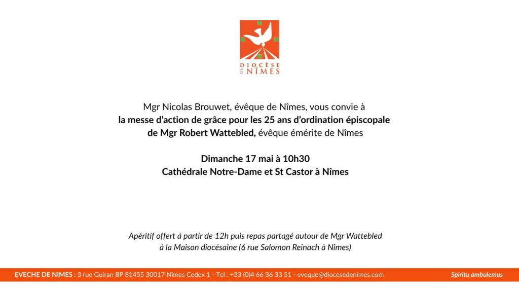 A l’occasion de cet anniversaire, Mgr Nicolas Brouwet, vous convie à la messe d’action de grâce des 25 ans d’ordination de Mgr Robert Wattebled, évêque émérite de Nîmes, le dimanche 17 mai à 10h30 à la Cathédrale St Castor à Nîmes.