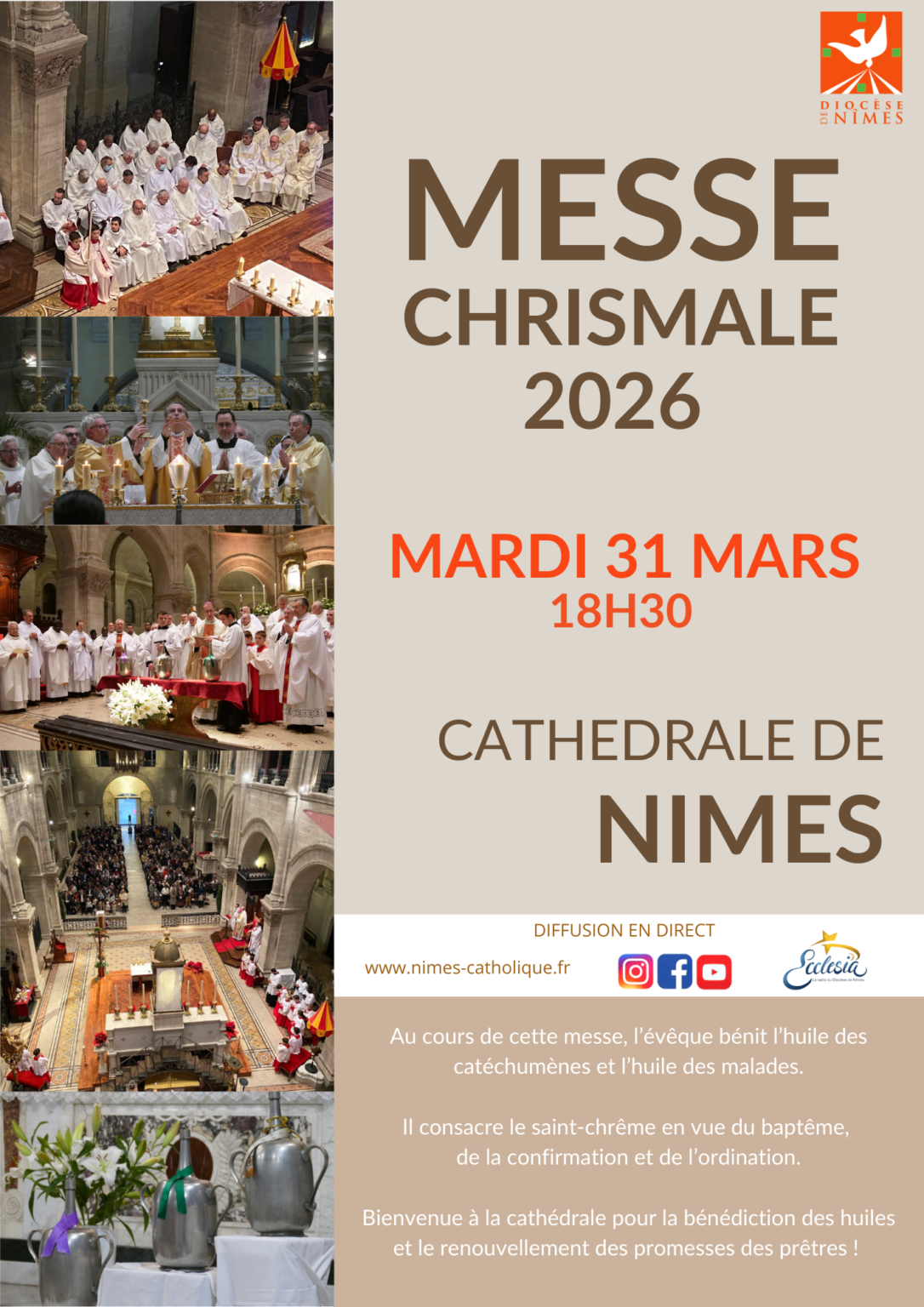 La messe chrismale sera célébrée le mardi 31 mars 2026 à 18h30 en la cathédrale Notre Dame et St Castor de Nîmes.