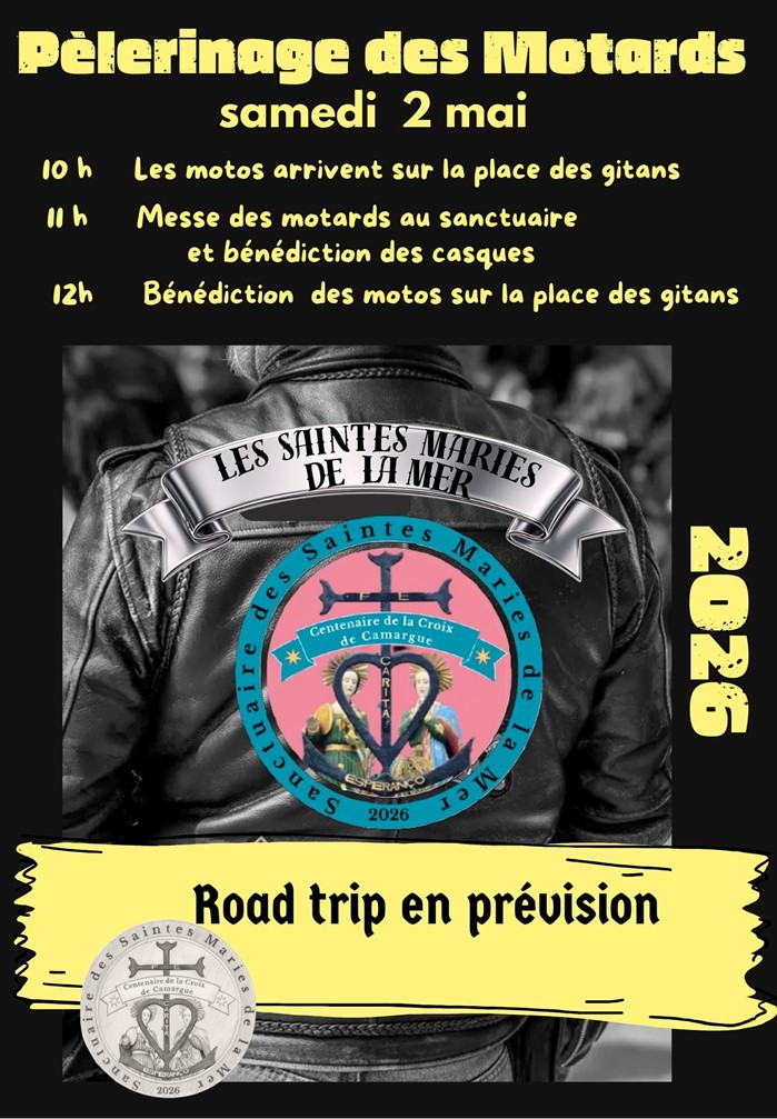 Le samedi 02 mai 2026, le Sanctuaire des Saintes organise à nouveau un pèlerinage des motards. A 11 heures, la messe sera célébrée au Sanctuaire par Don Emmanuel, avec la bénédiction des casques. Et à l’issue de la célébration, il bénira les motos place des Gitans.