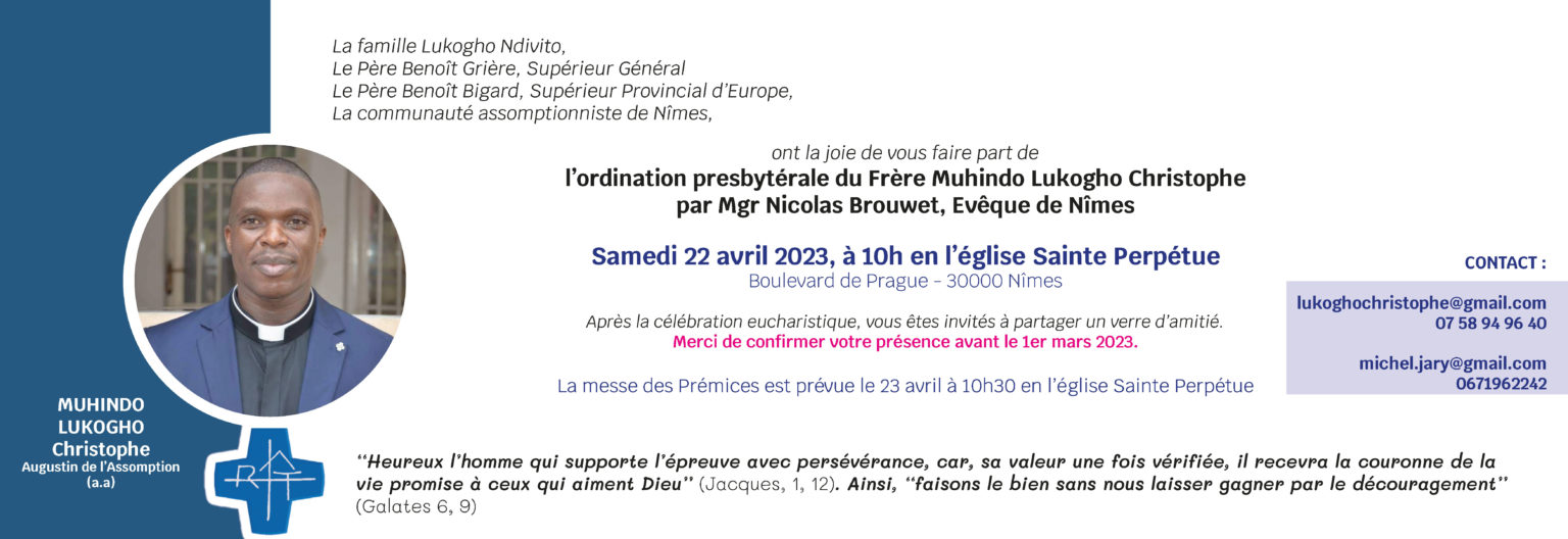 La famille Lukogho Ndivito, le Père Benoît Grière, Supérieur Général, le Père Benoît Bigard, Supérieur Provincial d’Europe, la communauté assomptionniste de Nîmes, ont la joie de vous faire part de l’ordination presbytérale du Frère Muhindo Lukogho Christophe par Mgr Nicolas Brouwet, évêque de Nîmes, samedi 22 avril 2023, à 10h en l’église Sainte Perpétue.